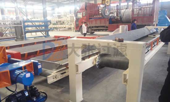 水平輸送機至于壓濾機底部,采用可承重橫梁,增加導(dǎo)泥裝罝,重型支腿,可以把壓濾機直接放置在輸送機上。